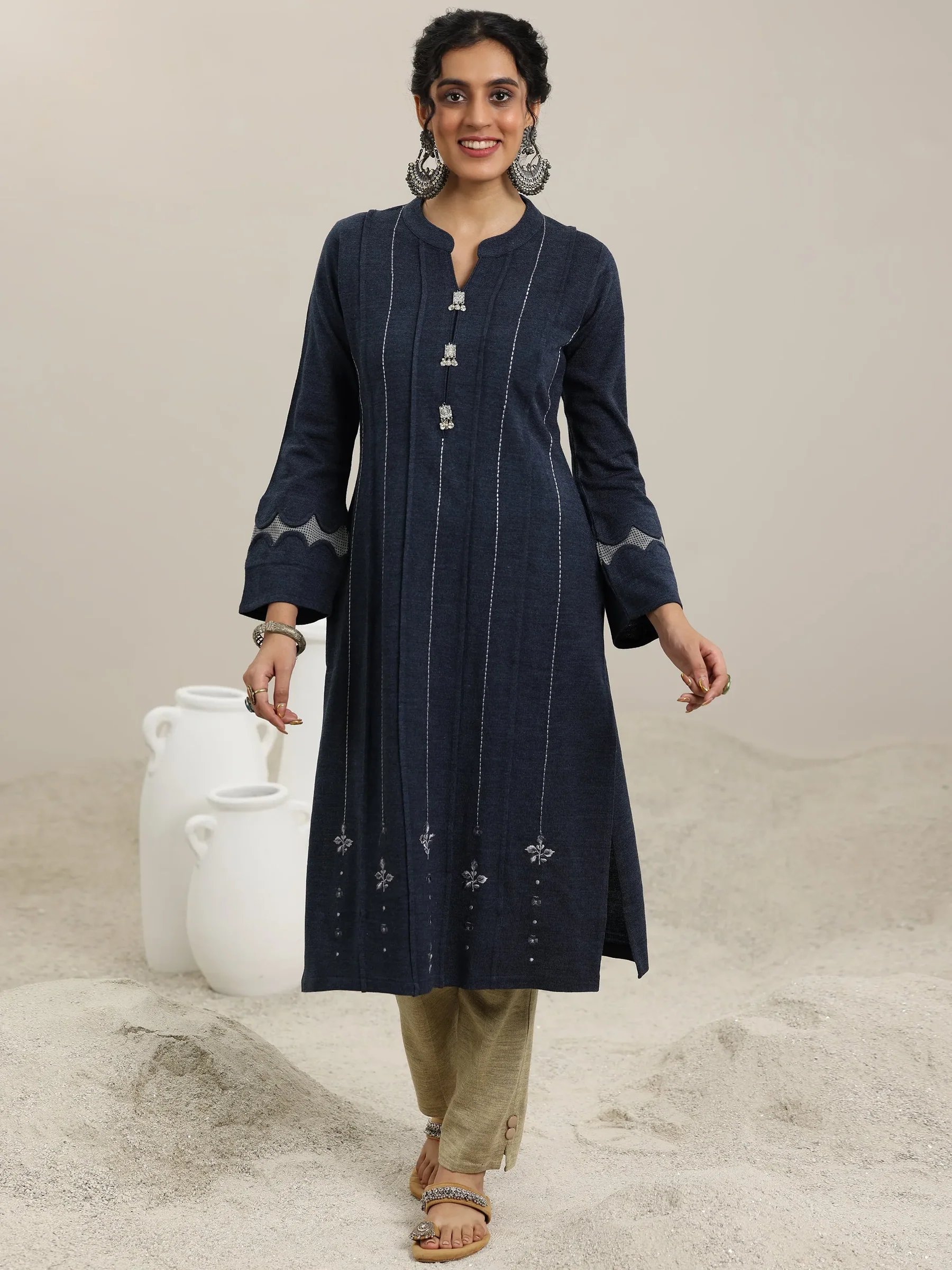 Grey Embroidered Wool Straight Kurta
