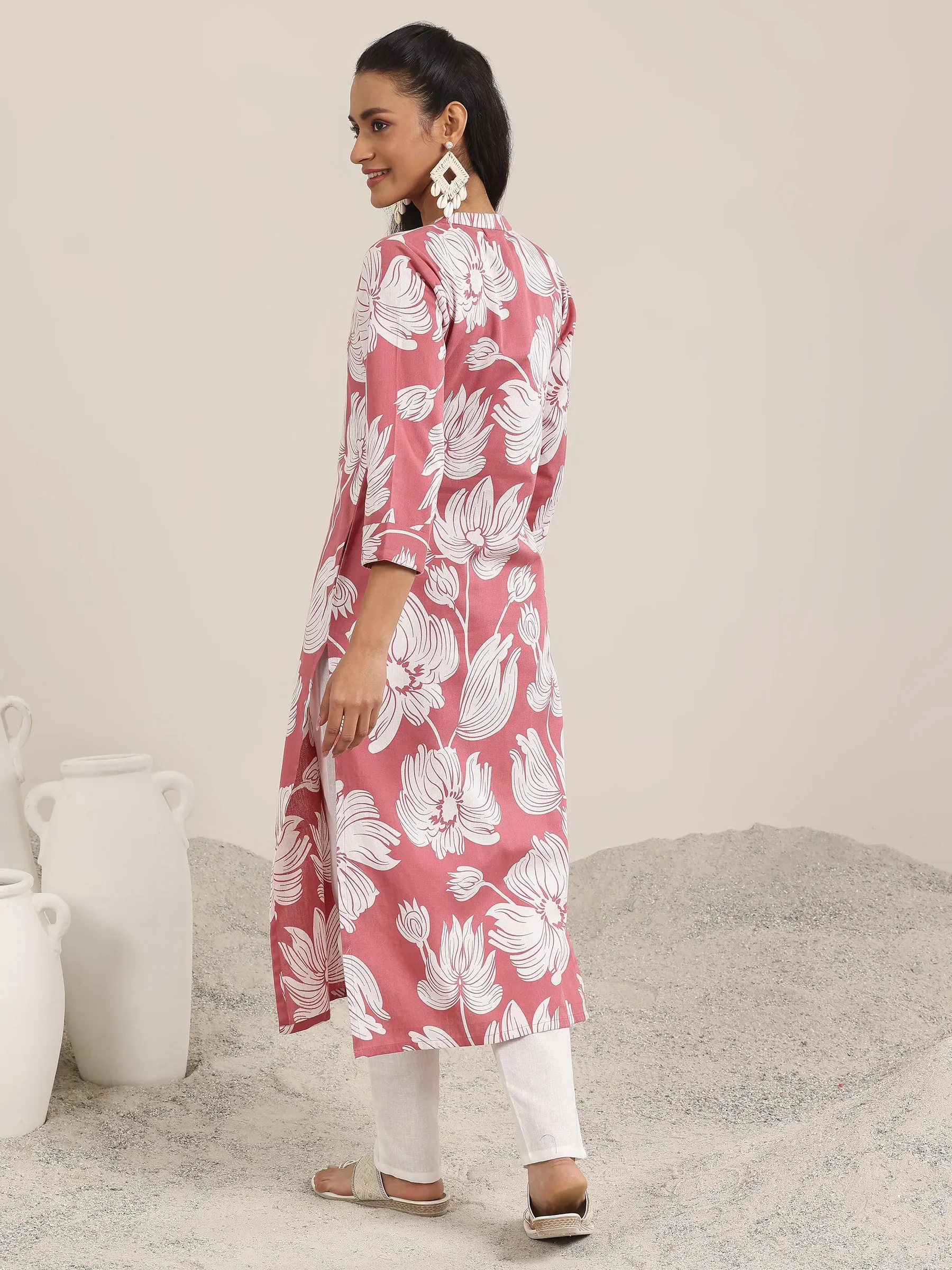 Pink Printed Cotton Blend Straight Kurta